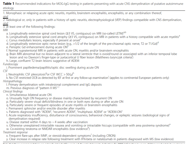 - “In practice, many patients diagnosed with AQP4-IgG-negative NMOSD according to the IPND 2015 criteria will meet also the criteria for MOG-IgG testing … and should thus be tested. However, MOG-IgG testing should not be restricted to patients with AQP4-IgG-negative NMOSD” (Jarius et al., 2018).