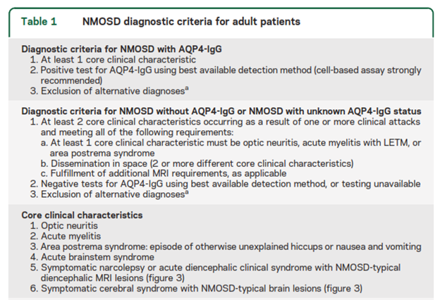 The International Panel on NMOSD recommends “testing with cell-based serum assays (microscopy or flow cytometry-based detection) whenever possible because they optimize autoantibody detection (mean sensitivity 76.7% in a pooled analysis; 0.1% false-positive rate in a MS clinic cohort).” They state that ELISA and indirect immunofluorescence assays have lower sensitivity and “strongly” recommend “interpretative caution if such assays are used and when low-titer positive ELISA results are detected in individuals who present with NMOSD clinical symptoms less commonly associated with AQP4-IgG (e.g., presentations other than recurrent optic neuritis, myelitis with LETM, or area postrema syndrome) or in situations where clinical evidence suggests a viable alternate diagnosis. Confirmatory testing is recommended, ideally using 1 or more different AQP4-IgG assay techniques. Cell-based assay has the best current sensitivity and specificity and samples may need to be referred to a specialized laboratory.” The table below outlines the NMOSD diagnostic criteria for adult patients (Wingerchuk et al., 2015).