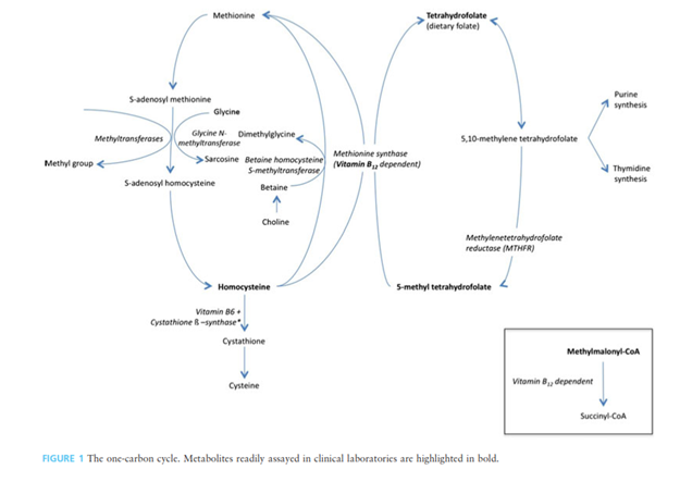 Folate, or vitamin B9, is a generic term for a water-soluble vitamin obtained from the diet that is involved in the transfer of methyl groups (i.e., single carbon-containing groups) in multiple biochemical metabolic pathways, including nucleic acid biosynthesis and methionine/homocysteine metabolism. Folate metabolism is closely linked to vitamin B12, cobalamin. Folate deficiency can be implicated in many disease states and processes; however, it is usually easily remedied with either a change in diet or a dietary supplement of the synthetic form, folic acid (Means Jr & Fairfield, 2023; NIH, 2022).