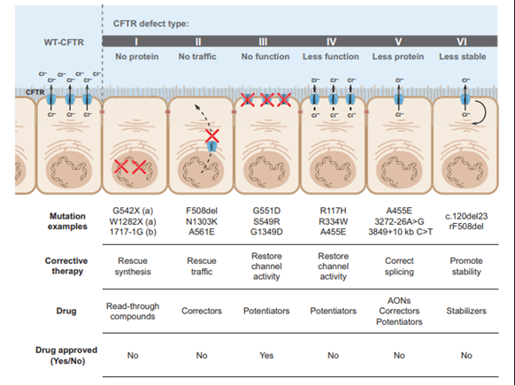 Most mutations of the CFTR gene are missense alterations, but other mutations, deletions and insertions have been described (Bell et al., 2015). Missense mutations occur when a single nucleotide is changed, resulting in a different amino acid which may affect the overall protein functionality. To date, over 2,000 mutations have been identified in the CFTR gene (CF Foundation, 2023). CFTR mutations can be divided into six classes according to their effects on protein function as depicted in the figure below (Bell et al., 2015)