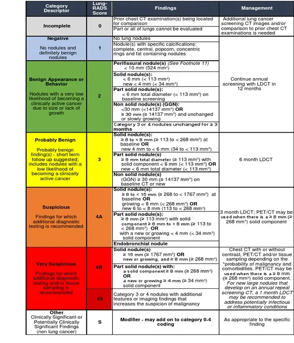 - Lung‐RADS® Version 1.1. American College of Radiology (ACR). Updated 2019. Accessed November 20, 2022. https://www.acr.org/-/media/ACR/Files/RADS/Lung-RADS/LungRADSAssessmentCategoriesv1-1.pdf