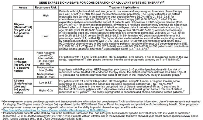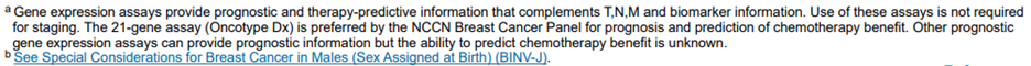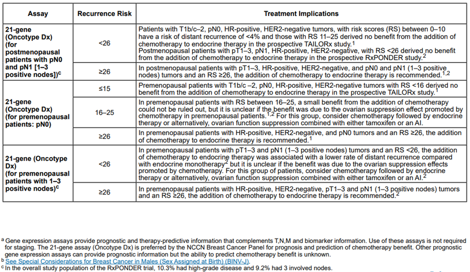 Note 3: As per NCCN Clinical Practice Guidelines in Oncology (Breast Cancer), “High clinical risk in the MINDACT trial was defined for grade 1 tumors as > 3 cm N0 or T2N1, for grade 2 tumors T2N0-1, and for grade 3 tumors T1c-2N0-1” (NCCN, 2024).
