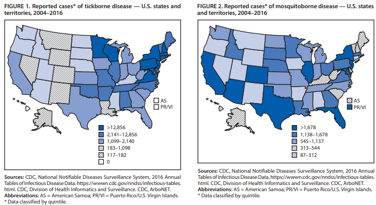 - Rosenberg, R., Lindsey, N. P., Fischer, M., Gregory, C. J., Hinckley, A. F., Mead, P. S., Paz-Bailey, G., Waterman, S. H., Drexler, N. A., Kersh, G. J., Hooks, H., Partridge, S. K., Visser, S. N., Beard, C. B., & Petersen, L. R. (2018). Vital Signs: Trends in Reported Vectorborne Disease Cases - United States and Territories, 2004-2016. MMWR Morb Mortal Wkly Rep, 67(17), 496-501. https://doi.org/10.15585/mmwr.mm6717e1