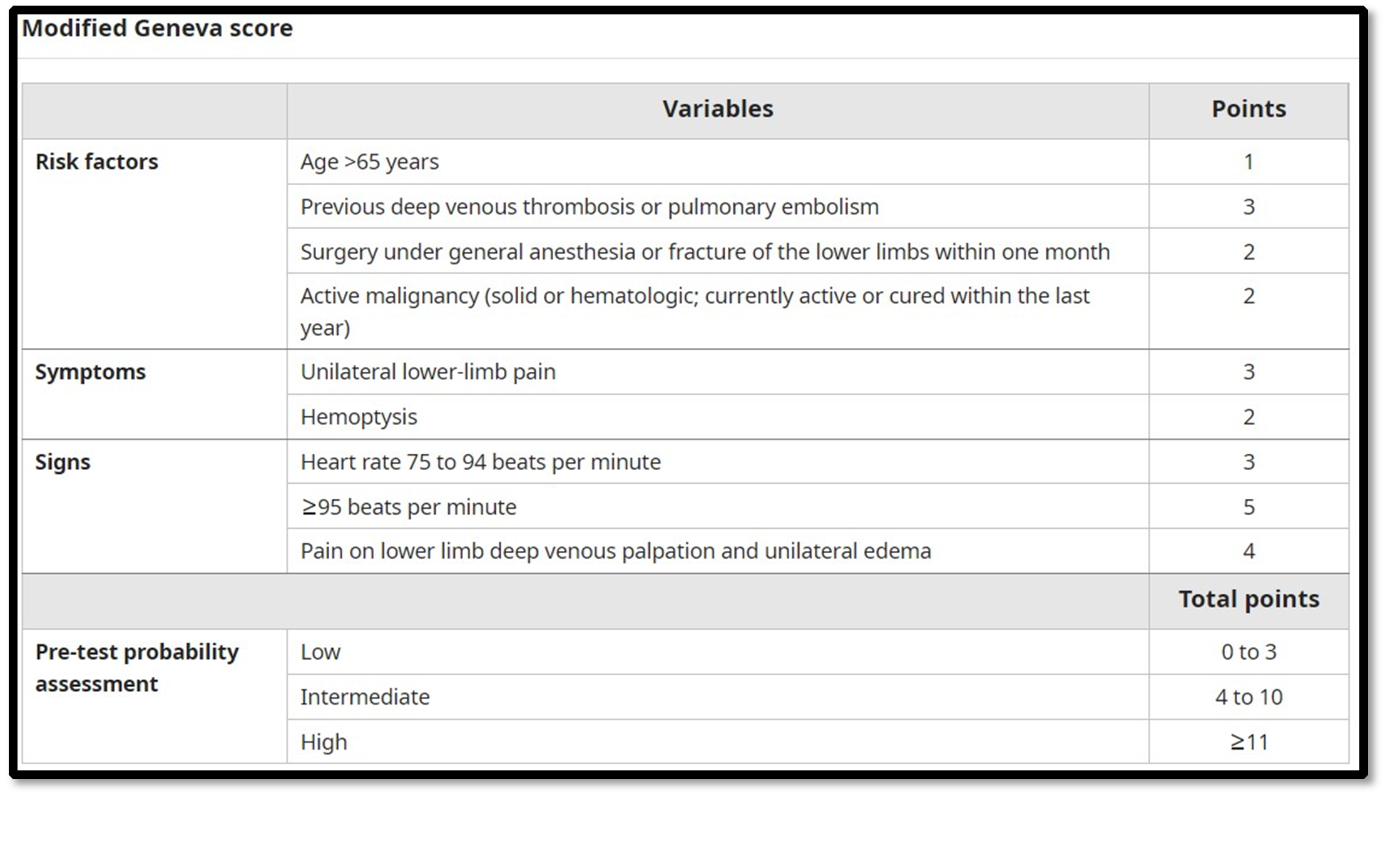 - Le Gal G, Righini M, Roy PM, et al. Prediction of pulmonary embolism in the emergency department: the revised Geneva score. Ann Intern Med. Feb 7 2006;144(3):165-71. doi:10.7326/0003-4819-144-3-200602070-00004
