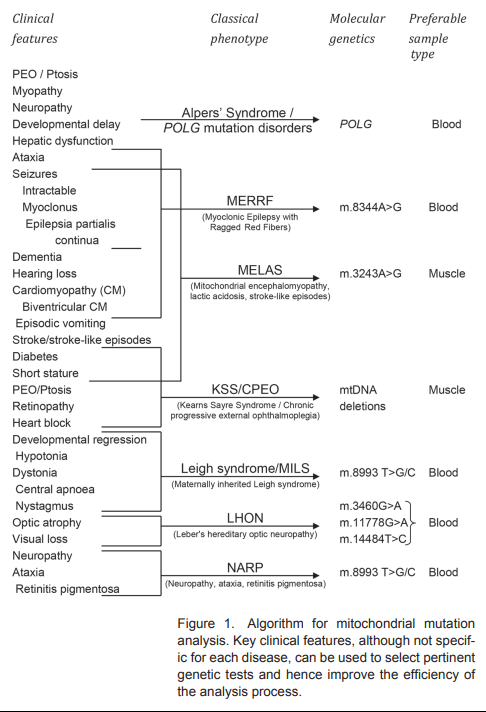 The figure below (taken from (O'Brien et al., 2014)) gives examples of classical phenotype mitochondrial diseases along with the clinical features and molecular genetics associated with each disorder.