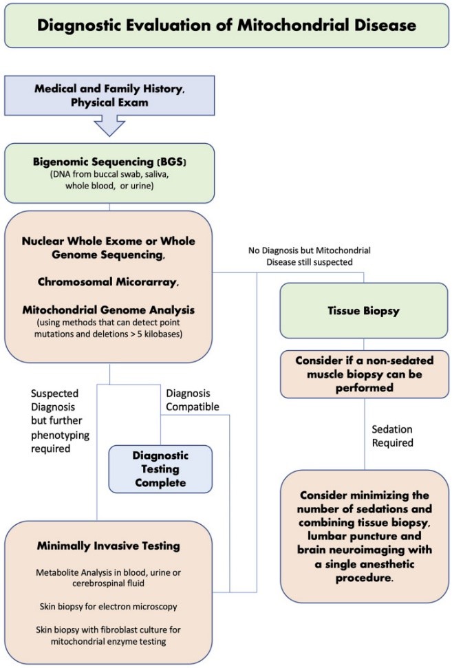 In a study by Kerr et al. (2020), 390 patients were recruited and tested for mitochondrial disease (MD) through traditional diagnostic pathways (metabolite analysis, tissue neuropathology and respiratory chain enzyme activity) and new diagnostic approaches (next generation sequencing (NGS) and nuclear whole exome sequencing (nWES)). Testing through traditional diagnostic methods resulted in a mitochondrial diagnosis in 115 out of 390 patients (29.50%). In comparison, 116 out of 390 patients were recruited for NGS, which identified 36 patients (31%) with a mitochondrial diagnosis. To confirm diagnosis, patients were further tested through nWES, which provided a secondary diagnosis in “two cases who already had a pathogenic variant in mtDNA, and a revised diagnosis (GLUL) in one case that had abnormal pathology but no pathogenic mtDNA variant” (Kerr et al., 2020). nWES also identified a mitochondrial diagnosis in one patient who tested negative from NGS. The author offers a diagnostic evaluation strategy, as shown in the figure below, and recommends that “a non-invasive, bigenomic sequencing (BGS) approach (using both a nWES and optimized mtDNA analysis to include large deletions) should be the first step in investigating for mitochondrial diseases. There may still be a role for tissue biopsy in unsolved cases or when the diagnosis is still not clear after NGS studies” (Kerr et al., 2020).