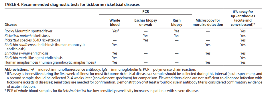 Diagnosis and Management of Tickborne Rickettsial Diseases (Biggs et al., 2016): In 2016, the CDC released their guidelines and recommendations concerning Rickettsial diseases, including Rocky Mountain spotted fever, in the MMWR. The table below summarizes their recommended diagnostic tests for tickborne rickettsial diseases: